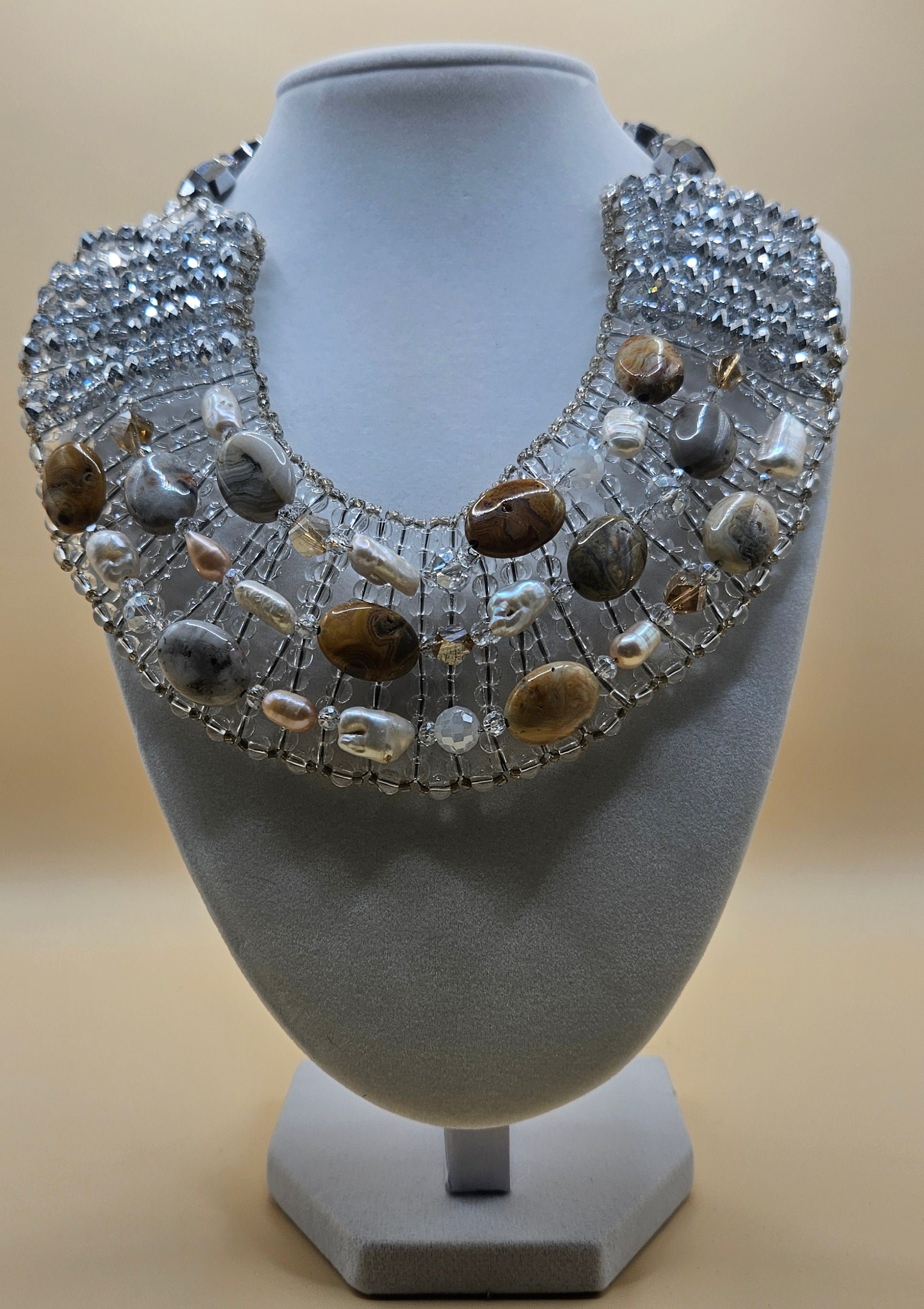 Add a touch of elegance to your outfit with this stunning Jasper, freshwater pearl, and sterling silver collar necklace. Crafted with high-quality materials and featuring a classy design, this necklace is the perfect accessory for any occasion. Upgrade your style and make a statement with this beautiful piece of jewelry.